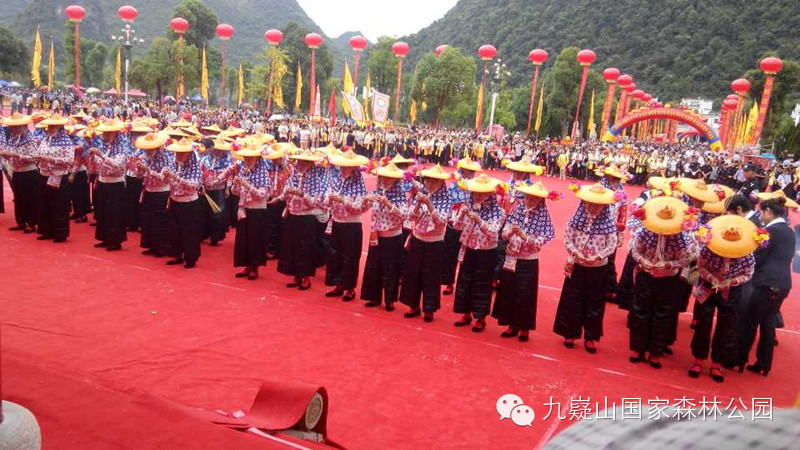 群山环绕,雨润恩泽,舜帝陵彩球高悬,旗幡猎猎。上午9时整,主祭队伍到达花团锦簇的九龙柱广场。九龙柱下龙狮腾舞,热情的瑶家阿哥阿妹分列红地毯两旁,跳起长鼓舞和伞舞,迎接远方来客。